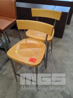 2 X COUNTER STOOLS - TIMBER SEAT, BENTWOOD BACK, CHROME FRAME & LEGS.