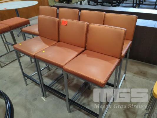7 X COUNTER STOOLS - SATIN LOOK, STITCHED PADDED SEATS & BACKS, CHROME FRAME & LEGS.