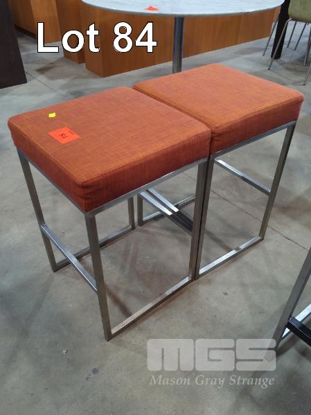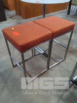 2 X COUNTER STOOLS - UPHOLSTERED PADDED SQUARE SEATS IN TEXTURED MIXED ORANGE/RED FABRIC WEAVE, CHROME FRAME & LEGS.