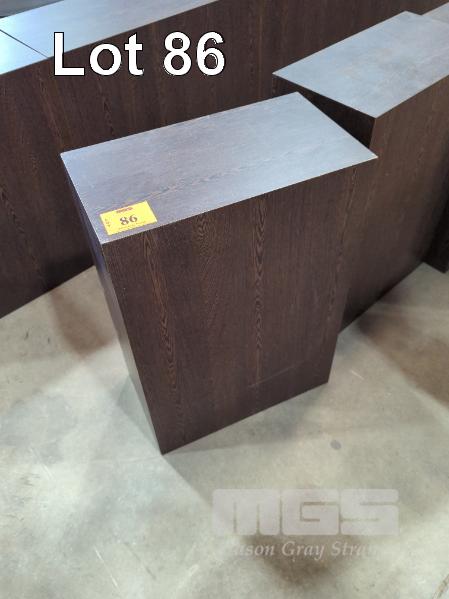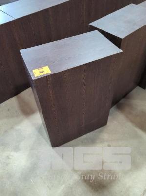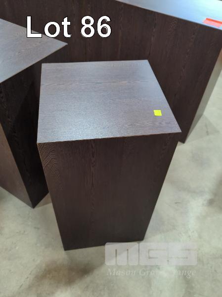 8 X SOLID CUBE STANDS IN WOODGRAIN TIMBER LAMINATE - COLOUR "BLACK ASH". 2 @ 66 X 45 X 25 CM. 6 @ 62 X 32 X 32 CM.
