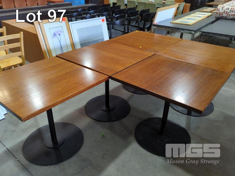 5 X FOUR-SEAT CAFE TABLES - HEAVY STEEL BASE IN BLACK, SOLID FINE GRAIN HARDWOOD TIMBER TOPS WITH INTERLOCK LUGS. 80 X 80 CM.