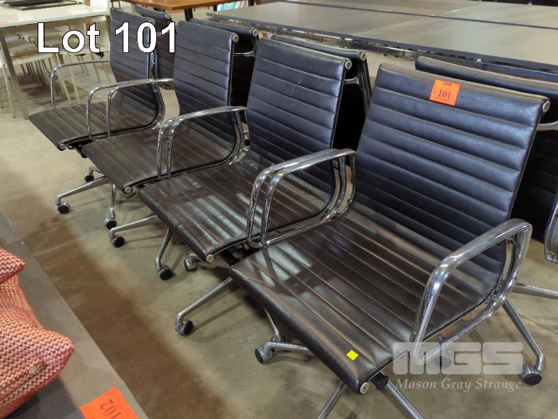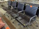 4 X EXECUTIVE CHAIRS - LOW BACK, BLACK STITCHED LEATHER LOOK SEAT & BACKREST, CHROME ARMRESTS, GAS LIFT, STEEL SWIVEL BASE ON CASTORS.