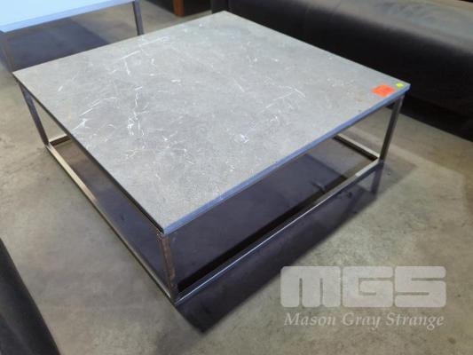STONE COFFEE TABLE - GREY MARLE TOP WITH INCLUSIONS, STAINLESS STEEL LOOK SQUARE TUBE BASE.