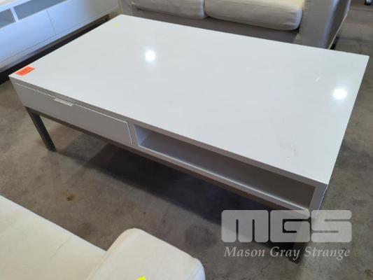 GLOSS WHITE COFFEE TABLE - TWO-DRAWER, MAGAZINE SHELF, BRUSHED NICKEL WATERFALL DRAW HANDLES, BRUSHED STEEL SQUARE TUBE FRAME & LEGS.