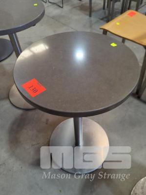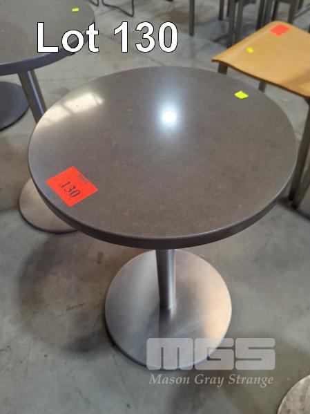 CIRCULAR, STONE PEDESTAL TABLE - STONE TOP IN DARK BROWN-GREY WITH INCLUSIONS, HEAVY STEEL BASE AND PEDESTAL IN BRUSHED STEEL. 46 CM DIAMETER, 68CM HEIGHT.