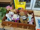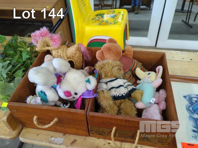 COLLECTION OF CHILDREN'S PLUSH TOYS, 2 X WOODEN TOY BOXES, PLASTIC STACKABLE TODDLERS CHAIRS AND 2 X PIECES OF WALL ART - TEDDY BEARS (1 X TABLE)