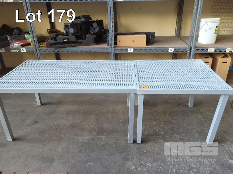 2 X OUTDOOR TABLES - COATED ALUMINIUM, MESH TOP, LIGHT GREY COLOUR.