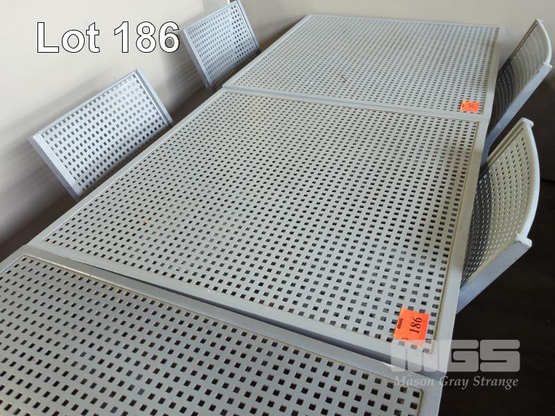 OUTDOOR TABLE - COATED ALUMINIUM, MESH CONSTRUCTION, LIGHT GREY COLOUR. 91 X 91 X 70 CM (W D H) 2 X MATCHING CHAIRS.