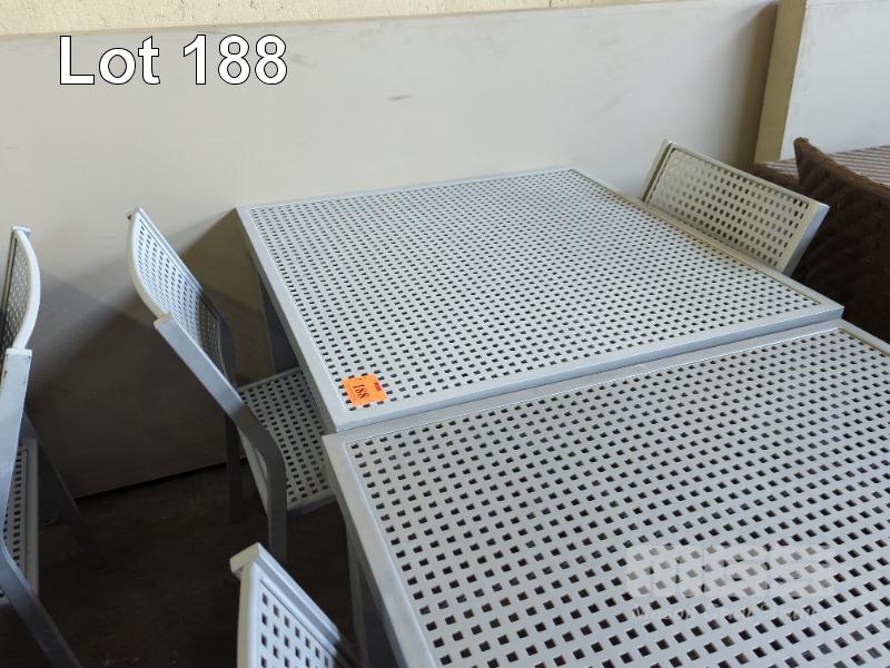 OUTDOOR TABLE - COATED ALUMINIUM, MESH CONSTRUCTION, LIGHT GREY COLOUR. 91 X 91 X 70 CM (W D H) 2 X MATCHING CHAIRS.