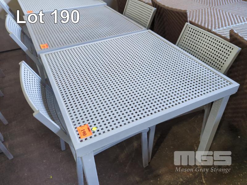OUTDOOR TABLE - COATED ALUMINIUM, MESH CONSTRUCTION, LIGHT GREY COLOUR. 91 X 91 X 70 CM (W D H) 2 X MATCHING CHAIRS.