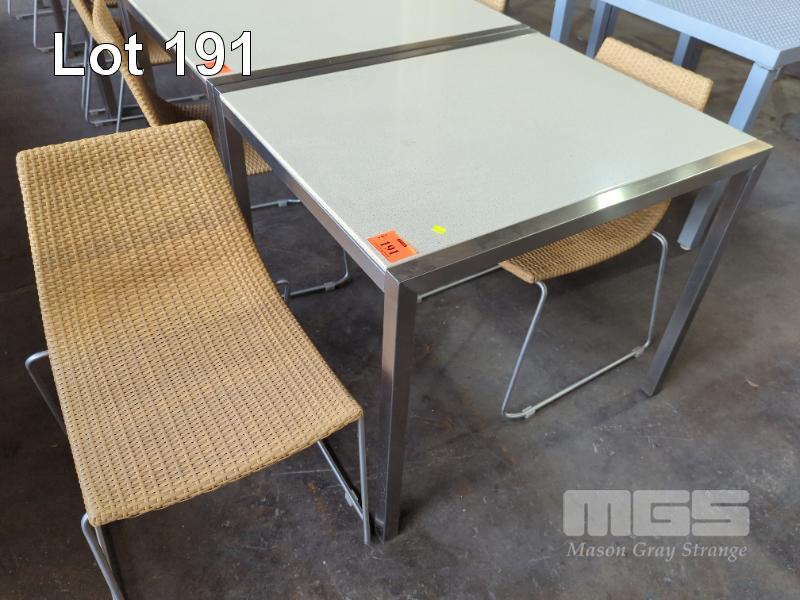OUTDOOR TABLE - ACRYLIC FAUX STONE TOP, POLISHED STAINLESS LOOK SQUARE TUBE SIDES, FRAME & LEGS. 90 X 75 X 74 CM (W D H) 2 X RATTAN CHAIRS - PE RATTAN, WHEAT COLOUR, POLISHED STAINLESS LOOK FRAME & LEGS, STACKABLE.