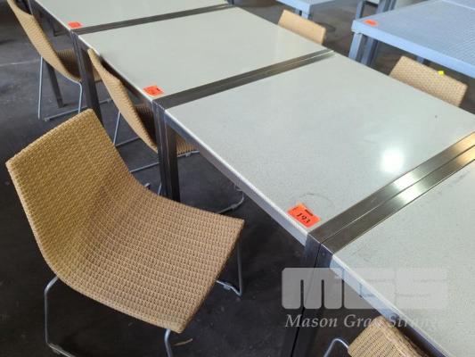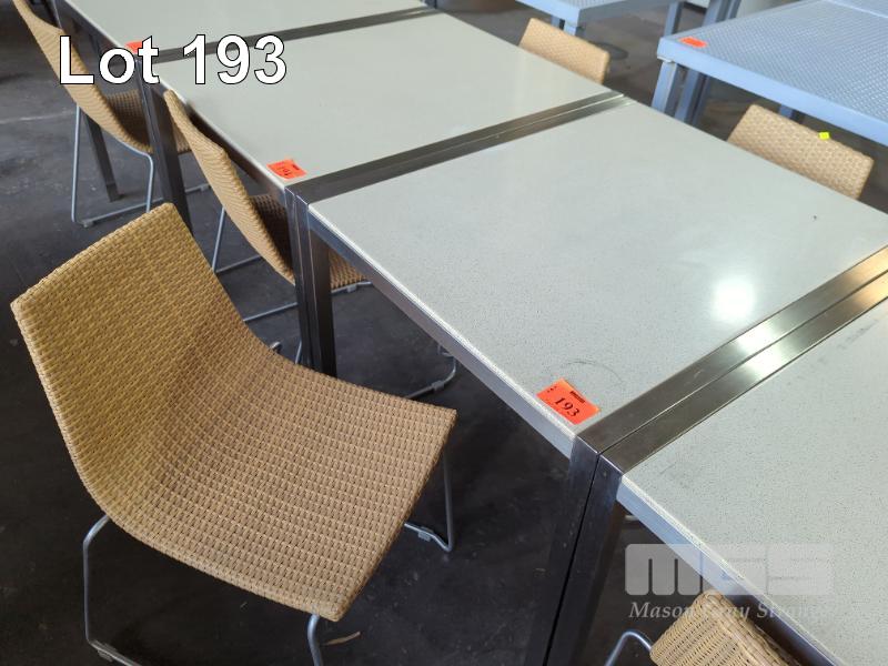 OUTDOOR TABLE - ACRYLIC FAUX STONE TOP, POLISHED STAINLESS LOOK SQUARE TUBE SIDES, FRAME & LEGS. 90 X 75 X 74 CM (W D H) 2 X RATTAN CHAIRS - PE RATTAN, WHEAT COLOUR, POLISHED STAINLESS LOOK FRAME & LEGS, STACKABLE.
