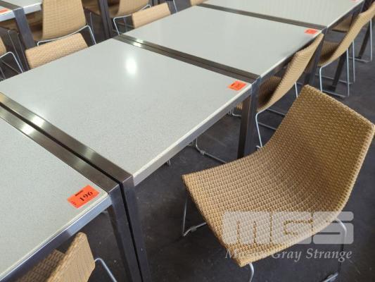OUTDOOR TABLE - ACRYLIC FAUX STONE TOP, POLISHED STAINLESS LOOK SQUARE TUBE SIDES, FRAME & LEGS. 90 X 75 X 74 CM (W D H) 2 X RATTAN CHAIRS - PE RATTAN, WHEAT COLOUR, POLISHED STAINLESS LOOK FRAME & LEGS, STACKABLE.