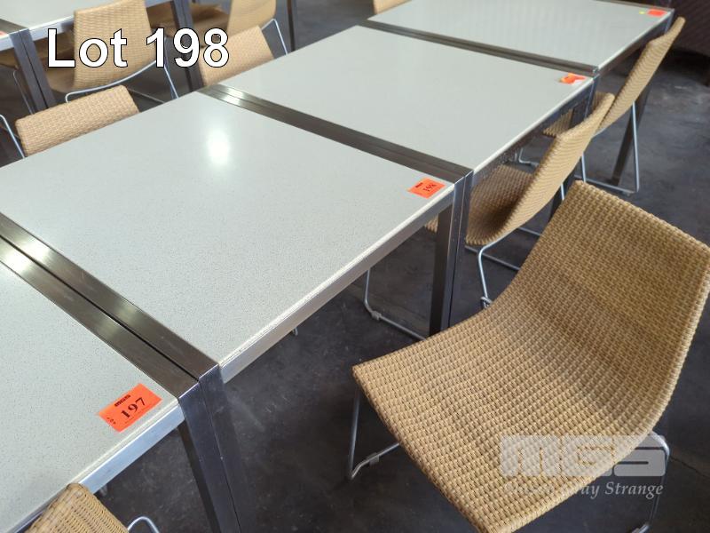 OUTDOOR TABLE - ACRYLIC FAUX STONE TOP, POLISHED STAINLESS LOOK SQUARE TUBE SIDES, FRAME & LEGS. 90 X 75 X 74 CM (W D H) 2 X RATTAN CHAIRS - PE RATTAN, WHEAT COLOUR, POLISHED STAINLESS LOOK FRAME & LEGS, STACKABLE.