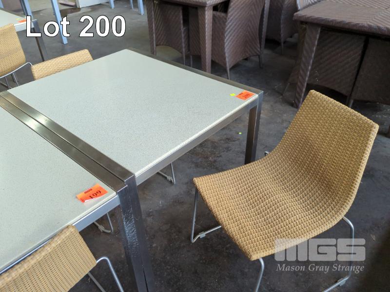 OUTDOOR TABLE - ACRYLIC FAUX STONE TOP, POLISHED STAINLESS LOOK SQUARE TUBE SIDES, FRAME & LEGS. 90 X 75 X 74 CM (W D H) 2 X RATTAN CHAIRS - PE RATTAN, WHEAT COLOUR, POLISHED STAINLESS LOOK FRAME & LEGS, STACKABLE.