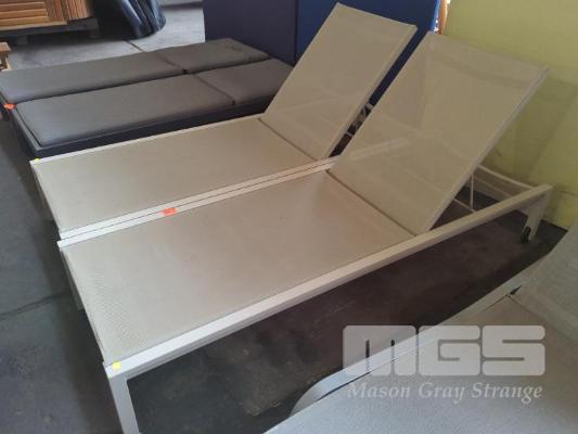 2 X SUN LOUNGES - COATED ALUMINIUM FRAMES, TECHNICAL FABRIC BED, COLOUR BEIGE ROLLING WHEELS.