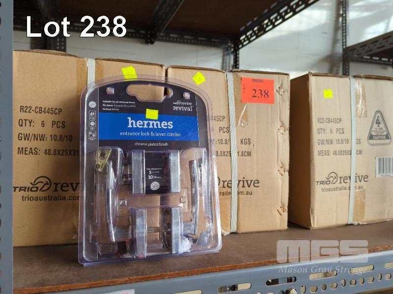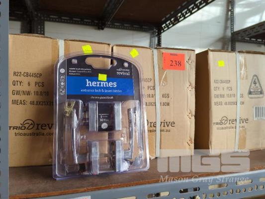 18 x ENTRANCE DOOR LOCK & LEVER COMBO SETS, TRIO REVIVE, HERMES, CHROME PLATED, 3 x BOXES