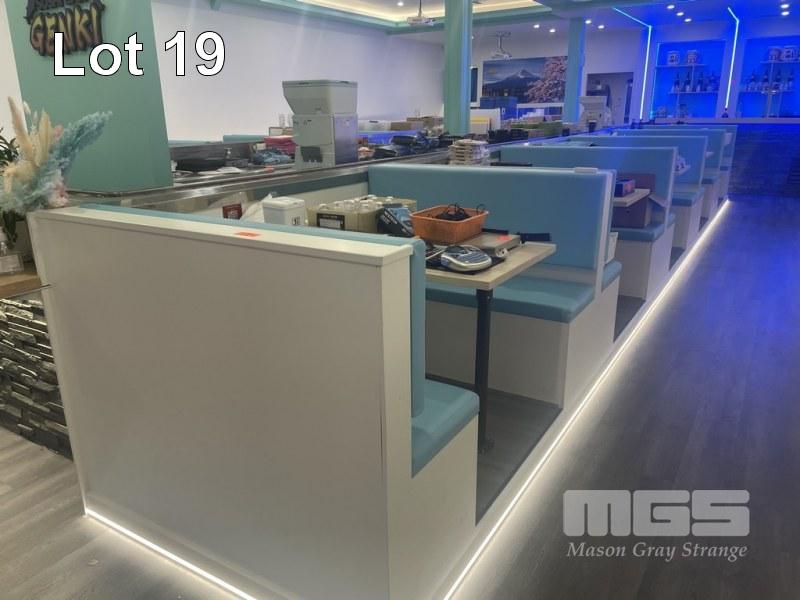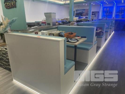 BOOTH SEATING COMPRISING 5 x BOOTHS EACH WITH TABLE, 160 x 63cm, BOOTHS 2 PACK LAMINATE WITH PALE BLUE VINYL UPHOLSTERED SEATING