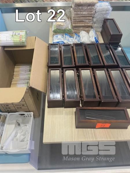 15 x CHOPSTICK BOXES, LARGE QUANTITY CHOPSTICKS, WOODEN SPOONS & FORKS, PLASTIC CHINESE SPOON & PLASTIC FORKS
