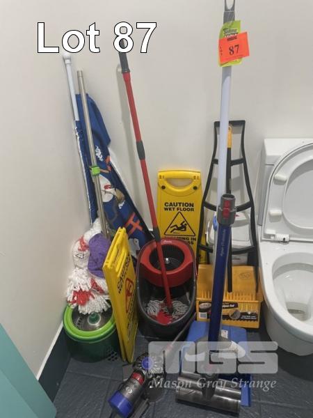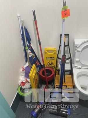 CLEANING EQUIPMENT, DYSON SV10 CORDLESS VAC, MOPS, BROOMS, SIGNS, ETC