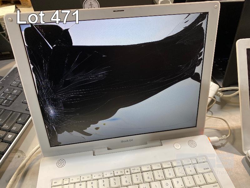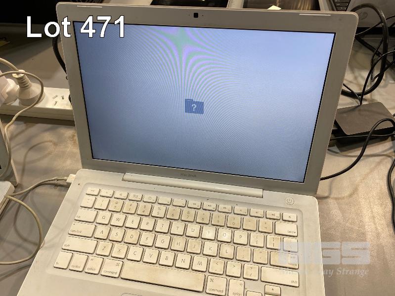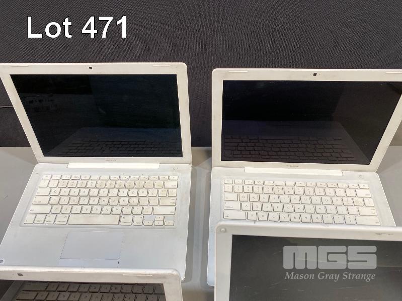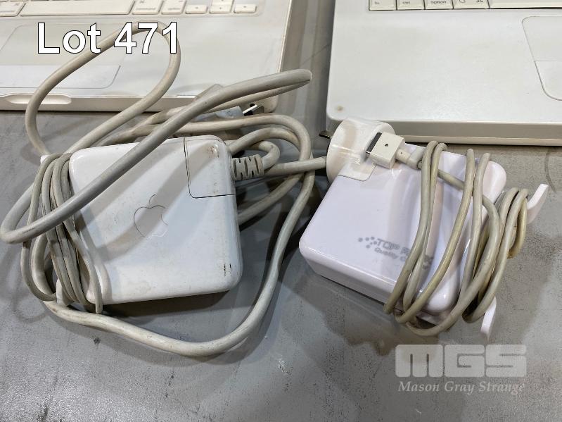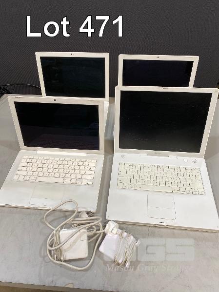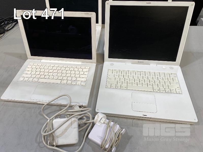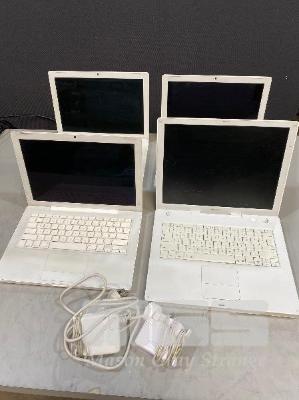 3 x APPLE MACBOOK CORE 2 DUO LAPTOPS, MODEL A1181 WITH 1 x POWER SUPPLY (2 x NOT POWERING ON) 1 x APPLE iBOOK G4 LAPTOP (DAMAGED SCREEN), MODEL A1055 WITH POWER SUPPLY