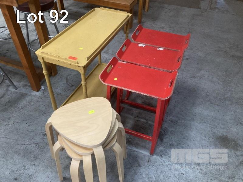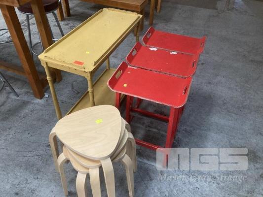 7 x ASSORTED TIMBER STOOLS & MOBILE SIDE TABLE