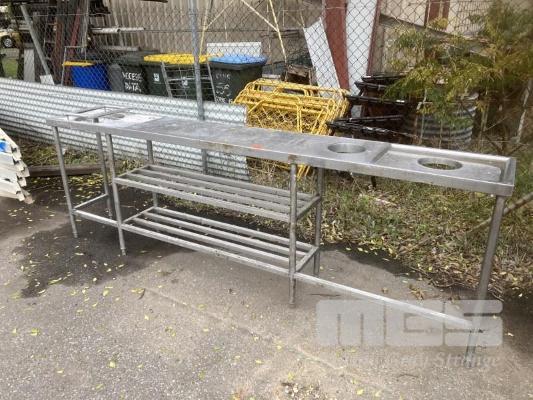 STAINLESS STEEL BENCH, 266 x 45cm, WITH 3 x RUBBISH CHUTES