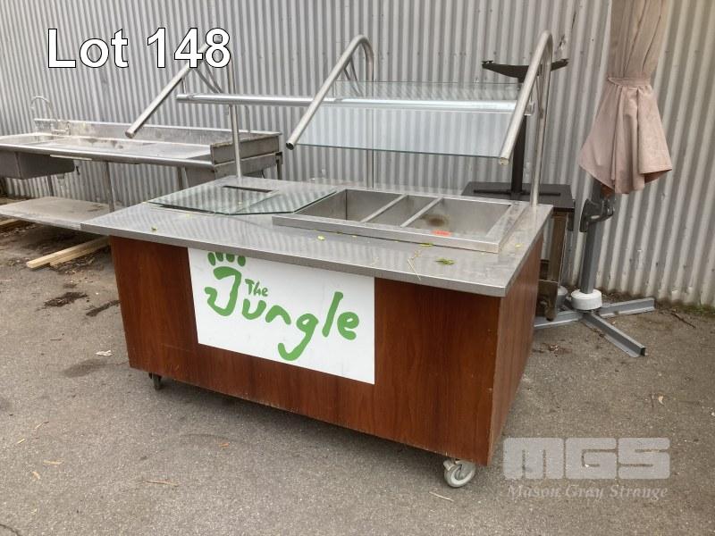 MOBILE HOT & COLD FOOD BAR, 180x 107cm, 24 240V WITH OVERHEAD LIGHTING & SNEEZE COVER (NOTE: 1 x GLASS PANEL DAMAGED)