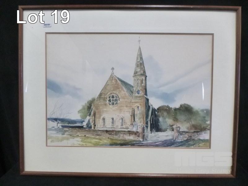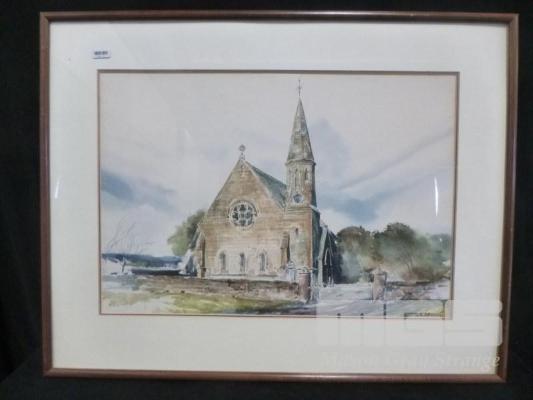 FRAMED WATERCOLOUR OF AN OLD STONE CHURCH, 1984, UNKNOWN ARTIST, FRAME SIZE 66 x 51cm