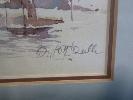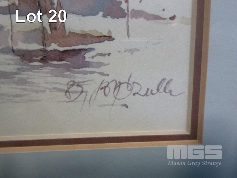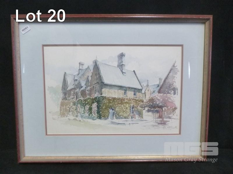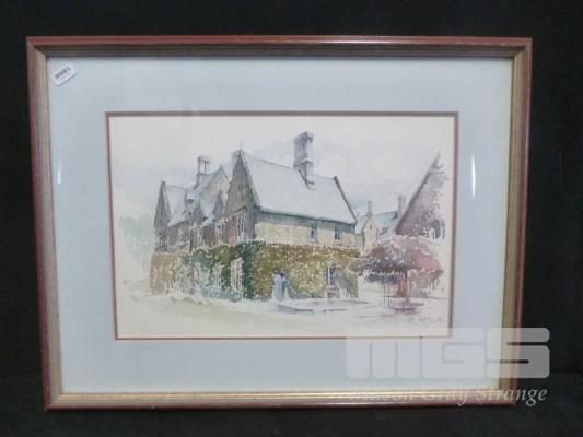 FRAMED WATERCOLOUR OF EARLY STONE BUILDINGS, 1985, UNKNOWN ARTIST, FRAME SIZE 53 x 41cm