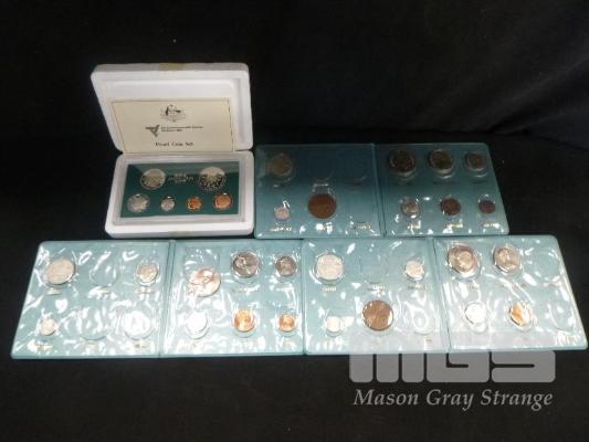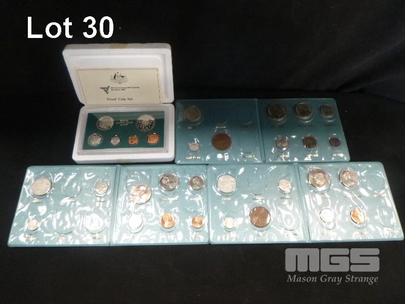 1982, ROYAL AUSTRALIAN MINT, PROOF COIN SET, 'XII COMMONWEALTH GAMES BRISBANE', & 3 X HENDO SOUVENIR COIN ALBUMS, LAST & FIRST ISSUE CURRENCY (INCOMPLETE FOLDERS)