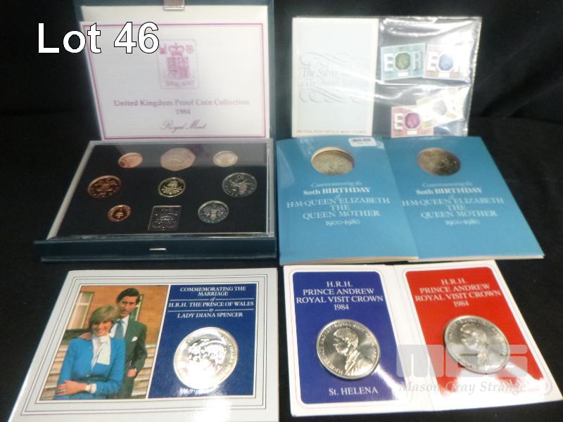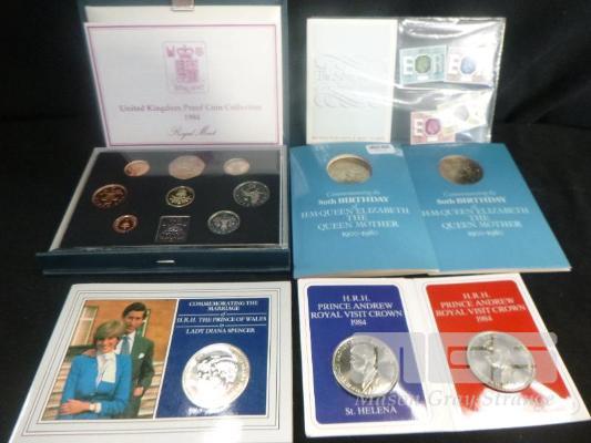 1984, THE ROYAL MINT, PROOF COIN SET & 2 X THE ROYAL MINT, 1900 -1980 COIN PACKS, COMMEMORATING THE 80th BIRTHDAY OF THE QUEEN MOTHER, PRINCE ANDREW ROYAL VISIT CROWNS, LADY DI & PRINCE CHARLES CROWN & SILVER JUBILEE BRITISH POST OFFICE STAMP SET