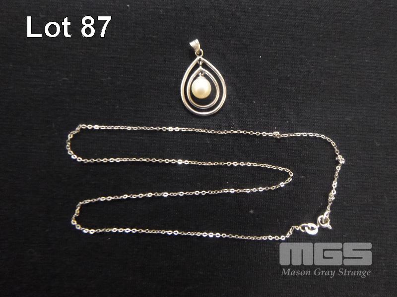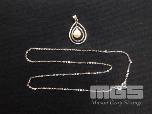 WHITE GOLD PENDANT WITH PEARL CENTRE, MARKED 14K, 3.06 grams & WHITE GOLD NECKLACE, MARKED 585, 1.36 grams