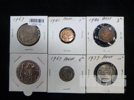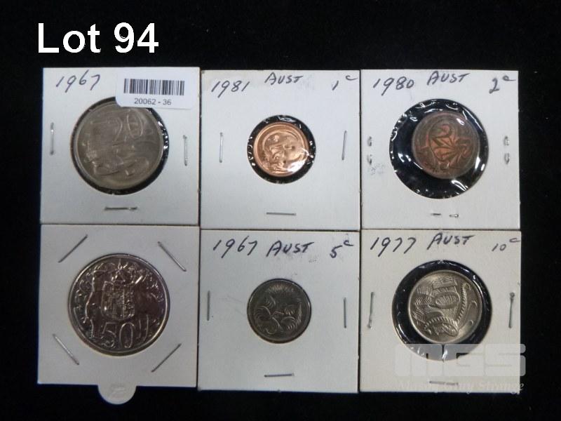 6 x AUSTRALIAN DECIMAL COINS INC 1966 ROUND 50 CENT, 1967 20 CENT, 1977 10 CENT, 1967 5 CENT, 1980 2 CENT & 1981 1 CENT COINS, EF OR aUNC