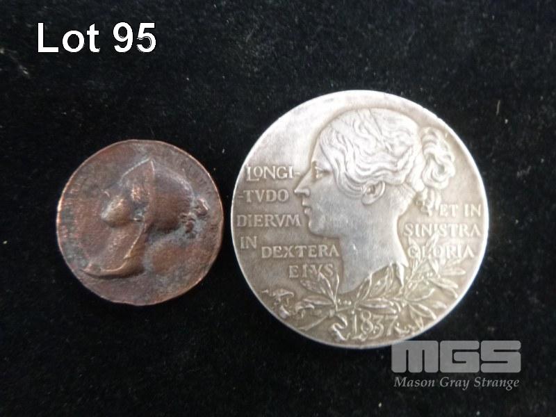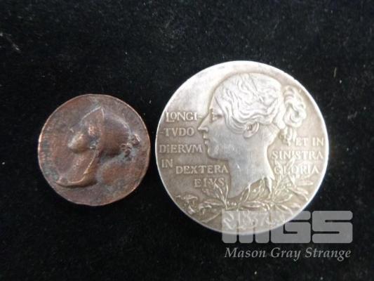 1837-1897 QUEEN VICTORIA STERLING SILVER MEDAL, 84.5gms, VF & EARLY COPPER COIN (POSSIBLY U.K PENNY)