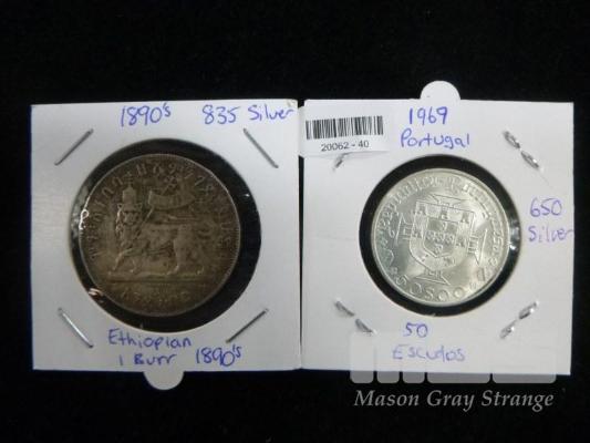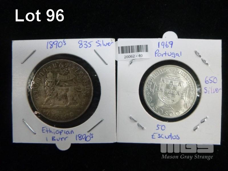 2 x SILVER COINS, 1 x 1890'S ETHIOPIAN 1 BURR, .835 SILVER COIN & 1969 PORTUGAL 50 ESCUDOS, .650 SILVER