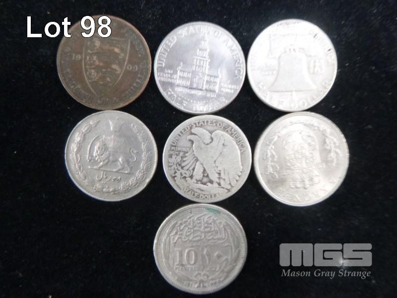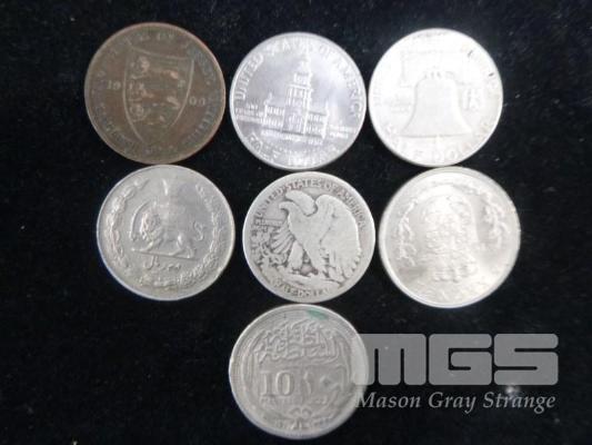 7 X WORLD COINS INC 3 X USA HALF DOLLARS 1917,1954 & 1976 200 YEARS OF FREEDOM, 5 KRONE, MIDDLE EASTERN ETC