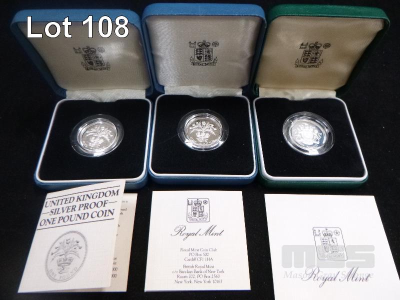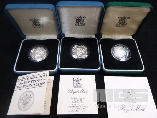 3 X THE ROYAL MINT, STERLING SILVER PROOF ONE POUND COINS, INC; 2 X 1984 & 1 X 1983