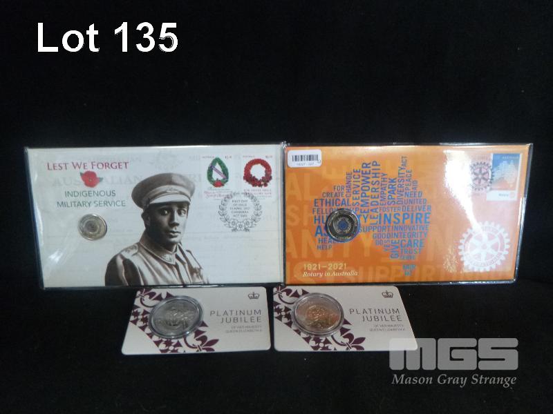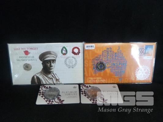 4 X AUSTRALIA COMMEMORATIVE COIN PACKS, INC; 1 X 2021 FIRST DAY COVER/$2 COIN, LEST WE FORGET, INDIGENOUS MILITARY SERVICE, 1 X 2021 FIRST DAY COVER/$1 COIN, 1921-2021 ROTARY IN AUSTRALIA, 2 X 2022 UNCIRCULATED, 50c COIN, 'PLATINUM JUBILEE OF HER MAJESTY QUEEN ELIZABETH II
