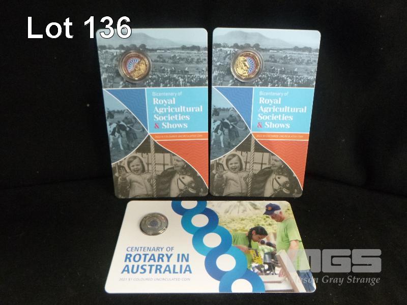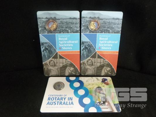 3 X ROYAL AUSTRALIAN MINT, $1 COLOURED UNCIRCULATED COIN PACKS, INC; 2 X 2022, BICENTENARY OF ROYAL AGRICULTURAL SOCIETIES & SHOWS & 1 X 2021, CENTENARY OF ROTARY IN AUSTRALIA