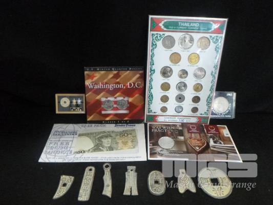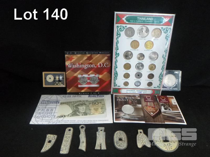 ASSORTED WORLD COINS, INC; 2009 WASHINGTON, D.C. US MINTED QUARTER DOLLAR, 1 OF 6, THAILAND OLD & CURRENT COMMEMORATIVE COIN PACK, 2015 AUSTRIA COIN PACK, SLABBED, 1965 SIR WINSTON CHURCHILL COMMEMORATIVE CROWN, CHINESE COINS & POLISH BANKNOTE