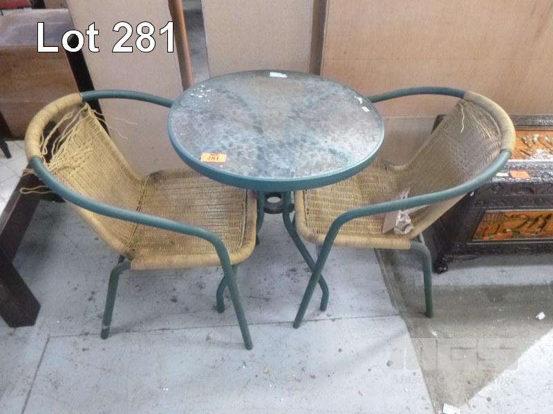 METAL FRAME 3 PIECE PATIO SETTING INC ROUND TABLE & 2 x ARM CHAIRS