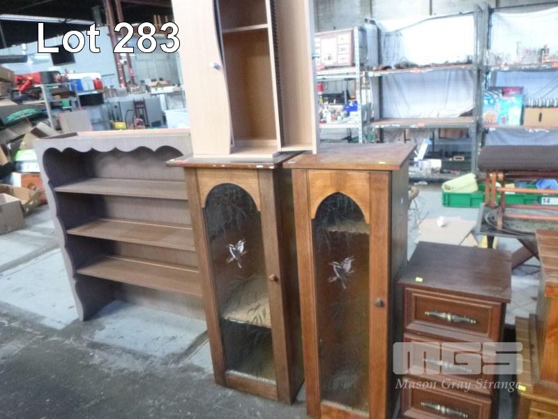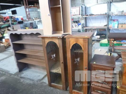 2 x TIMBER GLASS FRONTED CABINETS, BEDSIDE CABINET & TIMBER LAMINATE CD/DVD CABINET
