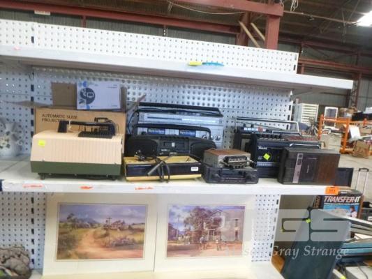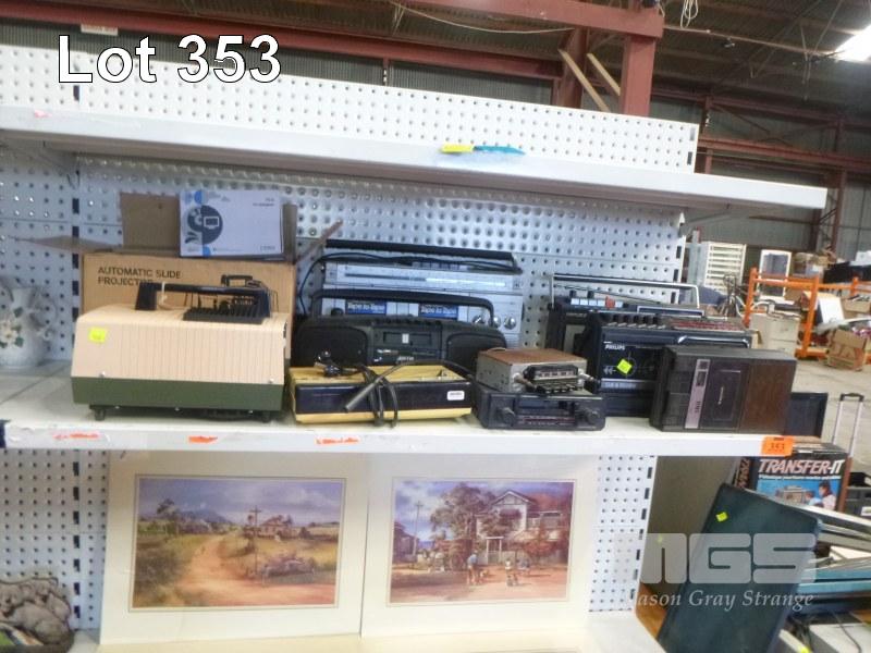 ASSORTED PORTABLE STEREOS, CAR STEREOS, CABIN & HANIMEX SLIDE PROJECTORS, 2 x PROJECTOR STANDS & 2 x PROJECTOR SCREENS, ETC
