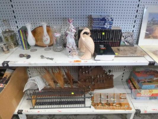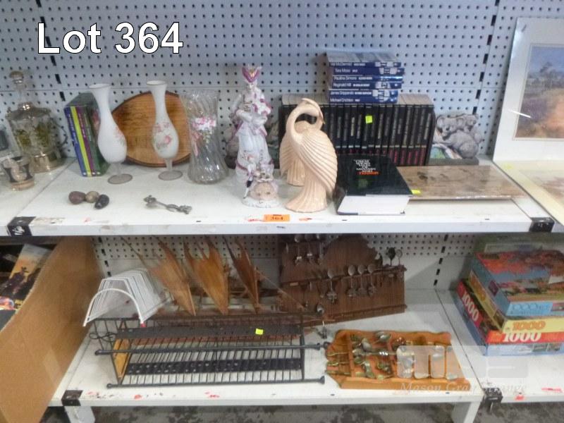 ASSORTED FIGURINES, ORNAMENTS, BOOKS, SOUVENRO SPOONS, CD TOWER, ETC, 2 x SHELVES