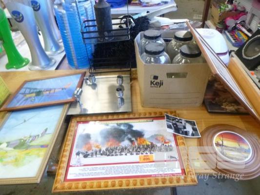 MILITARY RELATED FRAMED PRINTS, LARGE JARS, ETC