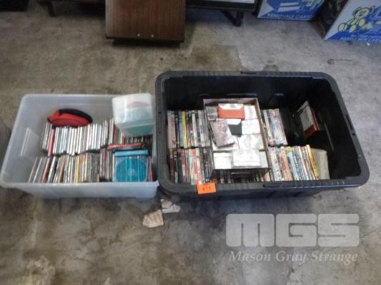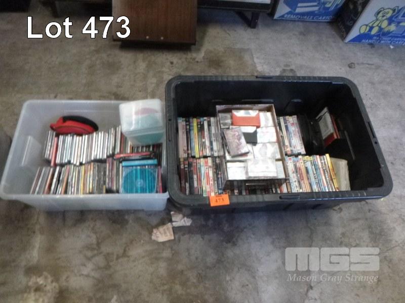 2 X TUBS OF ASSORTED MOVIE DVDS, MUSIC CDS AND CASSETTE TAPES.