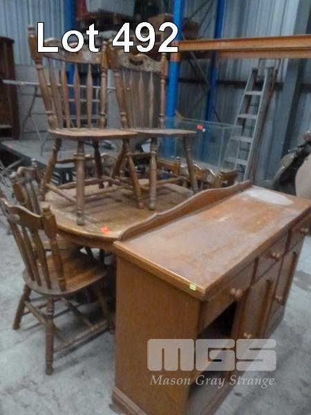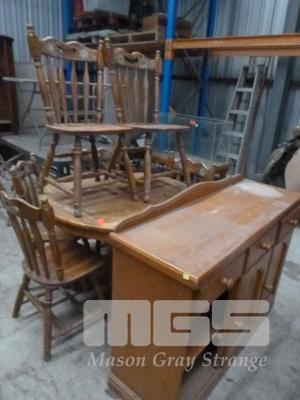 PINE 7 PIECE DINING SUITE INC 6 x SPINDLE BACK CHAIRS & ROUND EXTENSION DINING TABLE (STANED) WITH SIDEBOARD, (1 x DOOR MISSING)