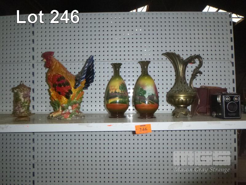 CERAMIC, GLAZED, COCKREL, PAINTED VASES, VINTAGE BROWNIE CAMERA, ETC