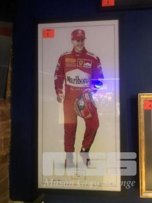 MICHAEL SCHUMACHER WORLD CHAMPION 2000 ORIGINAL PRINT LIMITED SERIES, NUMBER 309/500 SIGNED BY ARTIST JAMIE OSBORNE IN GLAZED FRAME, 535 x 1250mm